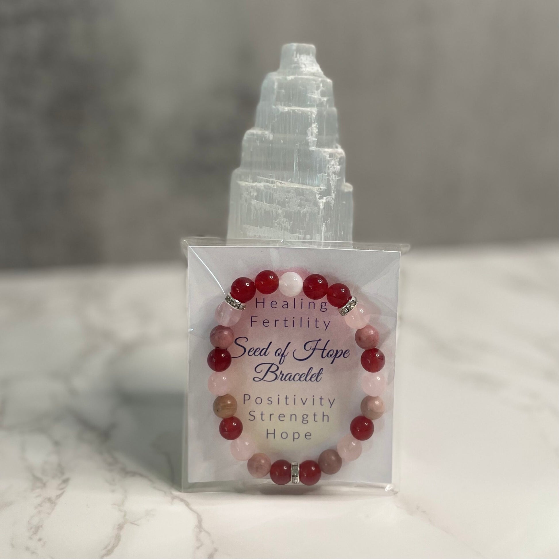 Our Seed of Hope bracelet radiates nurturing, empowering energy to support emotional healing, feminine balance, and reproductive vitality. Wearing these stones encourages clarity, quiet confidence, and a deep sense of inner trust. This bracelet is a beautiful companion and a meaningful gift for women on their journey to carrying life in their womb.