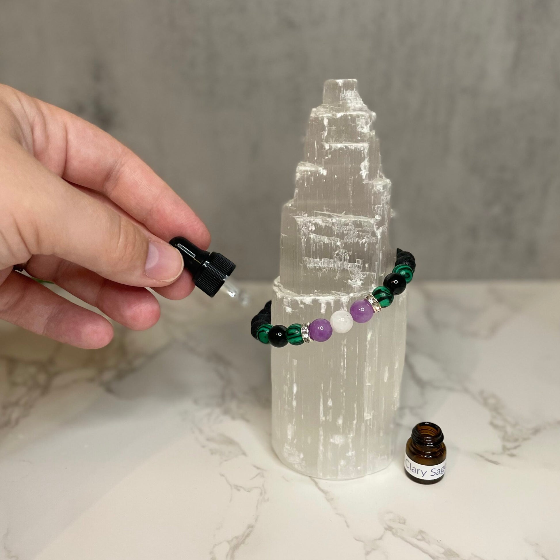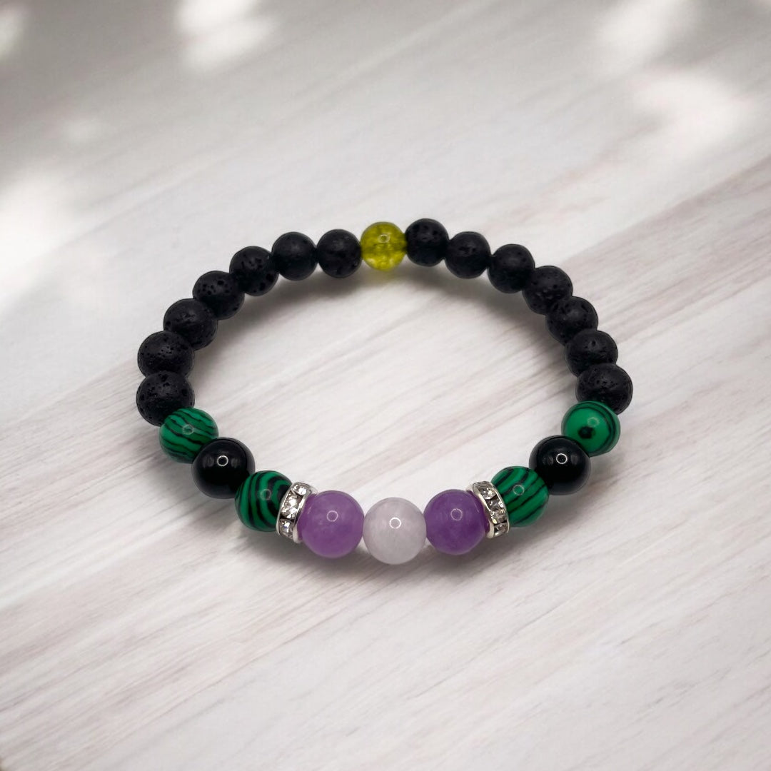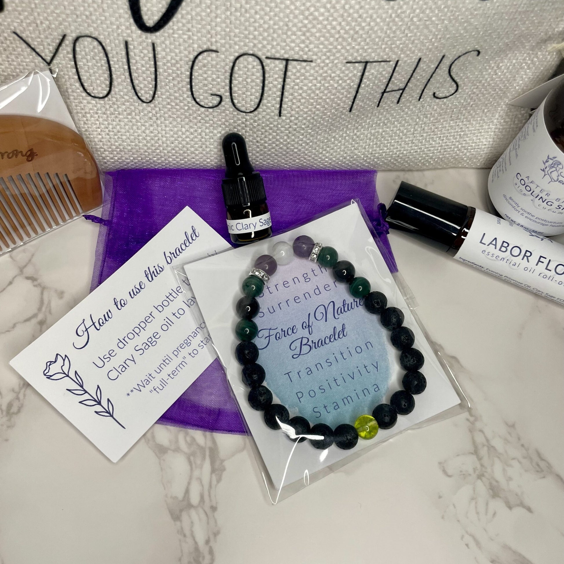 Our Force of Nature bracelet features Malachite, Peridot, Lepidolite, Moonstone, and Black Tourmaline, each chosen to support and ground you through the sacred transformation from maiden to mother. These powerful stones work together to ease labor sensations, enhance intuition, and provide strength and protection. A small bottle of Clary Sage is included for diffusing on the Lava Stones, promoting relaxation and steady progress through birth.