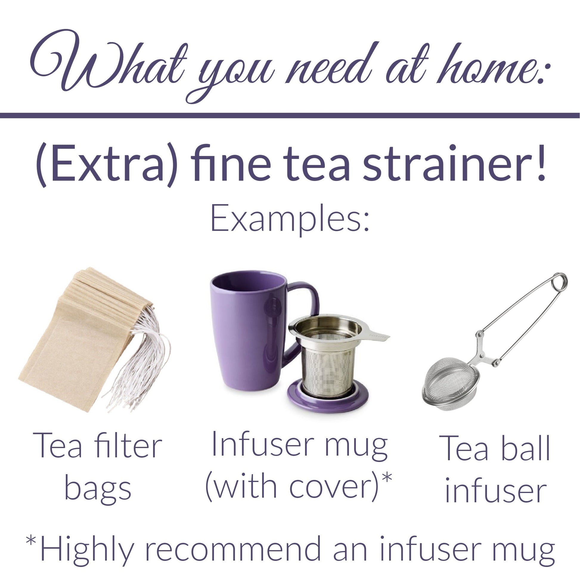 Store dry herbs in a cool, dark place. Pour 1 cup boiling water over 2-3 tsp dry herbs. Let stand for 10 mins. Strain. Use an extra fine mesh tea strainer for best results.